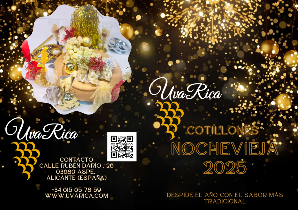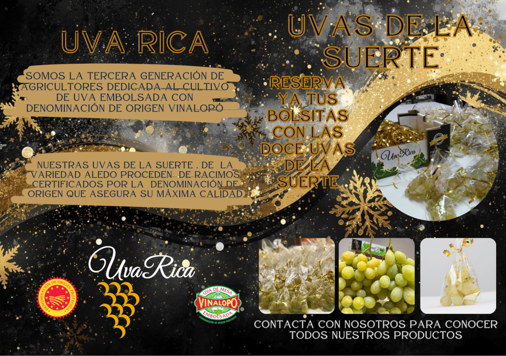 En Uva Rica ya estamos listos para celebrar contigo la llegada del nuevo año. Como cada diciembre, lanzamos nuestra campaña de uva para Nochevieja, con uvas de mesa DOP Uva de Mesa Embolsada del Vinalopó, seleccionadas cuidadosamente para que el momento de las campanadas sea especial, cómodo y lleno de buen sabor. Disponemos tanto de uvas tradicionales como de uvas sin semilla, ideales para niños y para quienes prefieren disfrutar de las doce uvas sin complicaciones. Nuestras uvas se presentan en distintos formatos pensados para celebraciones en casa, en restaurantes, colegios, asociaciones o eventos privados.