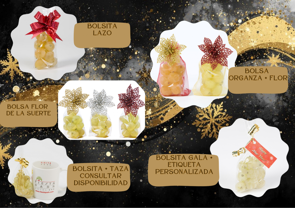 Además, este año completamos la experiencia con nuestra variedad de cotillones para la fiesta de Nochevieja, para que no falten la alegría, los accesorios y el toque festivo en el último día del año. Podemos preparar también bolsitas individuales de uvas de la suerte, listas para repartir y tomar justo en el momento de las campanadas, perfectas para grupos grandes, cenas familiares, empresas, eventos municipales o colegios. Solo tienes que elegir el tipo de uva (con o sin semilla) y el formato que mejor se adapte a tu celebración.